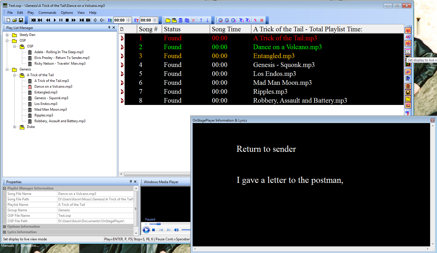 Overview OnStagePlayer is a windows media player extension specifically designed for the playing of backing tracks by musicians, using laptop PCs. OnStagePlayer solves the classic "non-stopping playlist" problem. Most, if not all media players such as mp3 hardware and software players, e.g. iPods, the standard Windows Media Player, mobile phones, etc, have no option where they can be prevented from automatically playing the next song in a playlist. This is sad news indeed for gigging musicians. Various techniques are used to alleviate this issue, but all have their short comings. For example, placing all songs in a folder of its own, or interspersing each song in a play list with a blank song of say, 30 seconds, in order to give the musician time to run back to the player and turn it off! OnStagePlayer stops when reaching the end of a song. Furthermore, OnStagePlayer can be set so that the next song in the playlist is automatically cued ready to play, such that the enter/return key can immediately start the next song. OnStagePlayer also has extensive additional features for managing groups of playlists not available in other media players. As of November 2019 - Lyric support has been added. Standard *.lrc files including additional support for extended Unicode character sets for Unicode - UCS-2/UTF-16 files that has the extension *.lrcx.